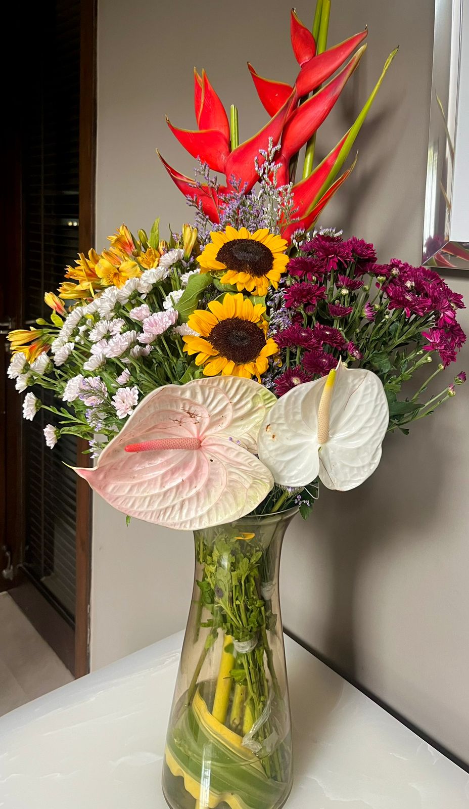 Heliconias, White Anthuriums, Purple Chrysanthemums, White Daisies, Yellow Inca Lilies, Sunflowers, Purple Limonium