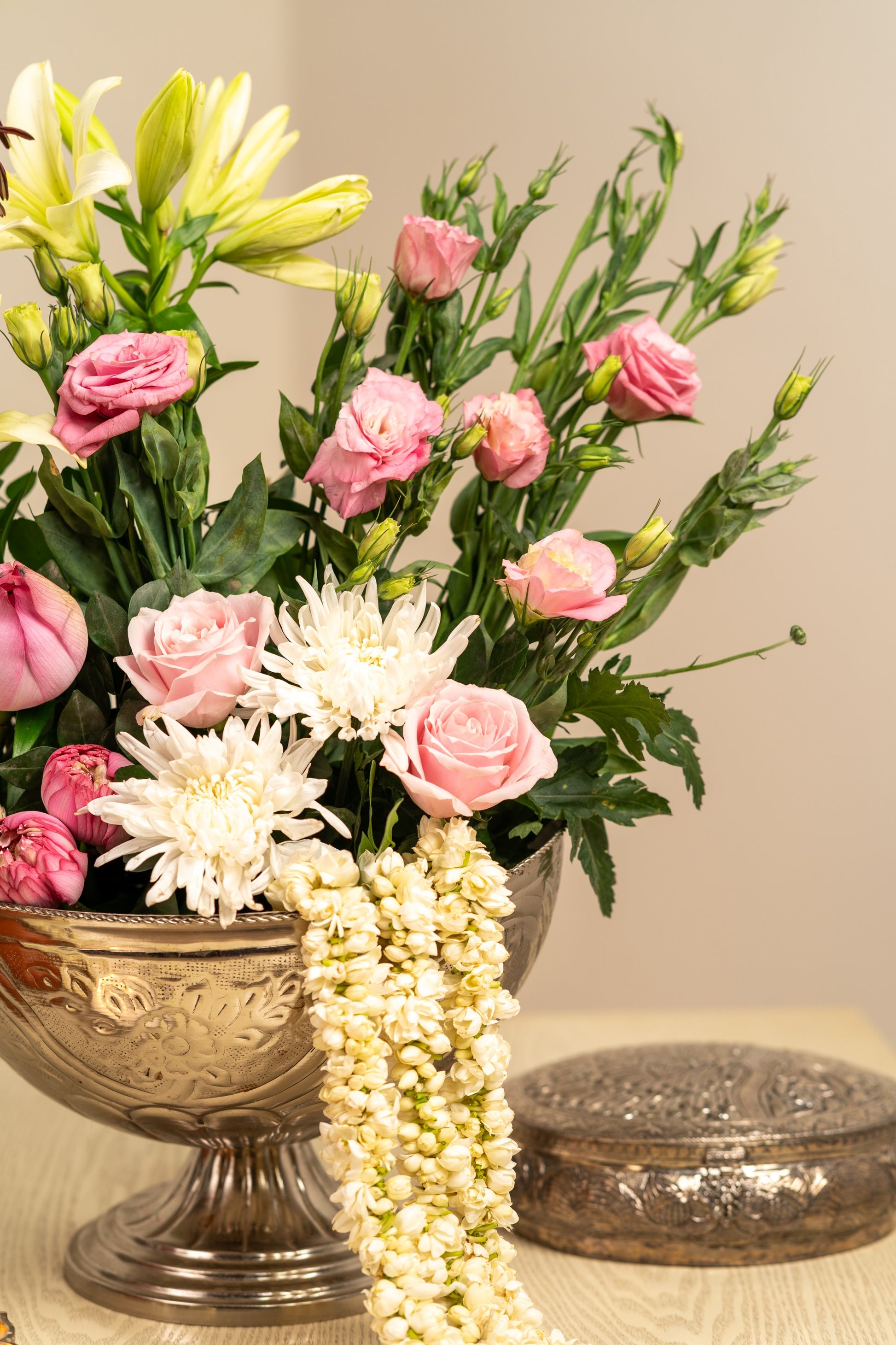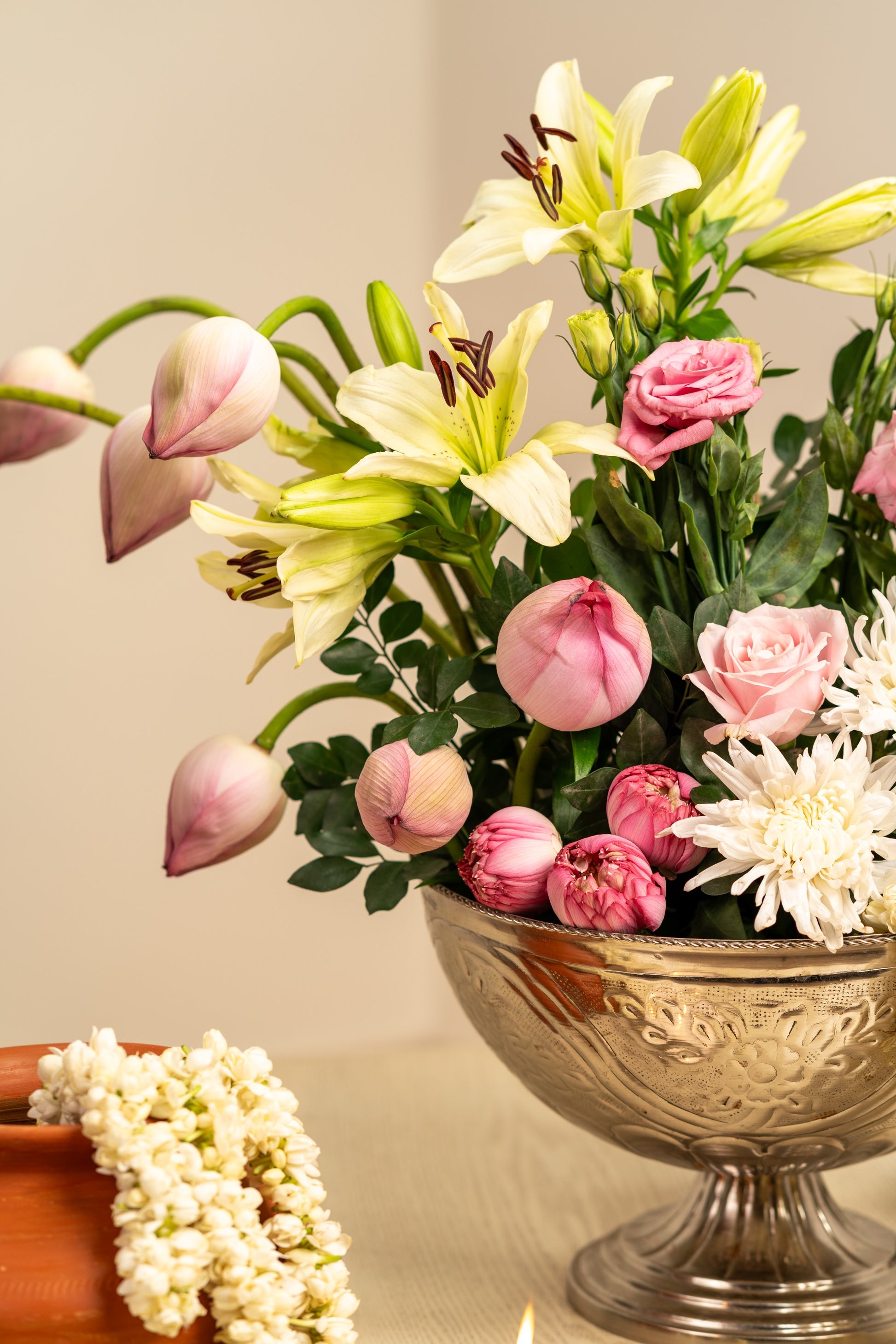 Lotus, pink rose, pink eustomas ,white eustomas, Lotus pods, jasmine
