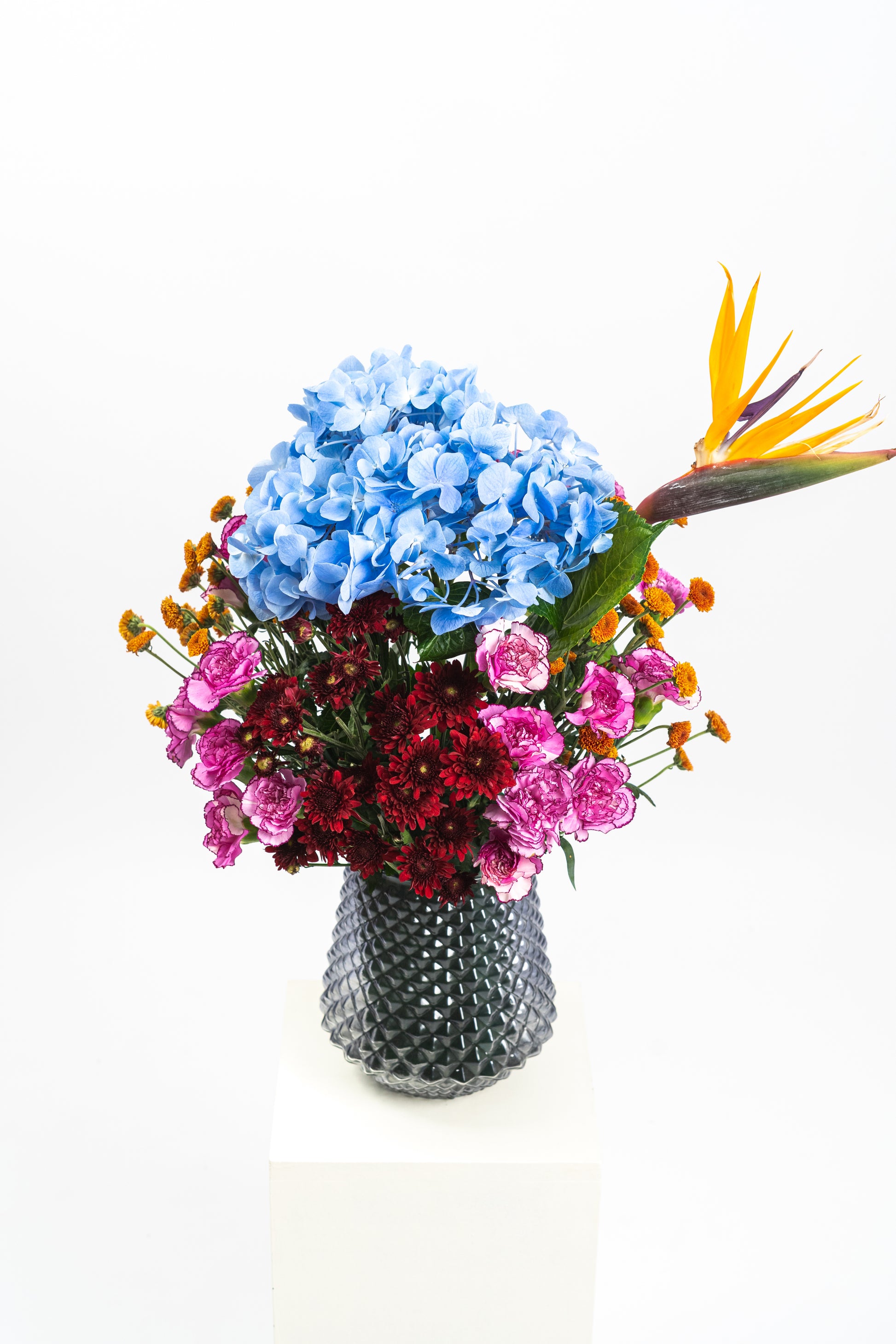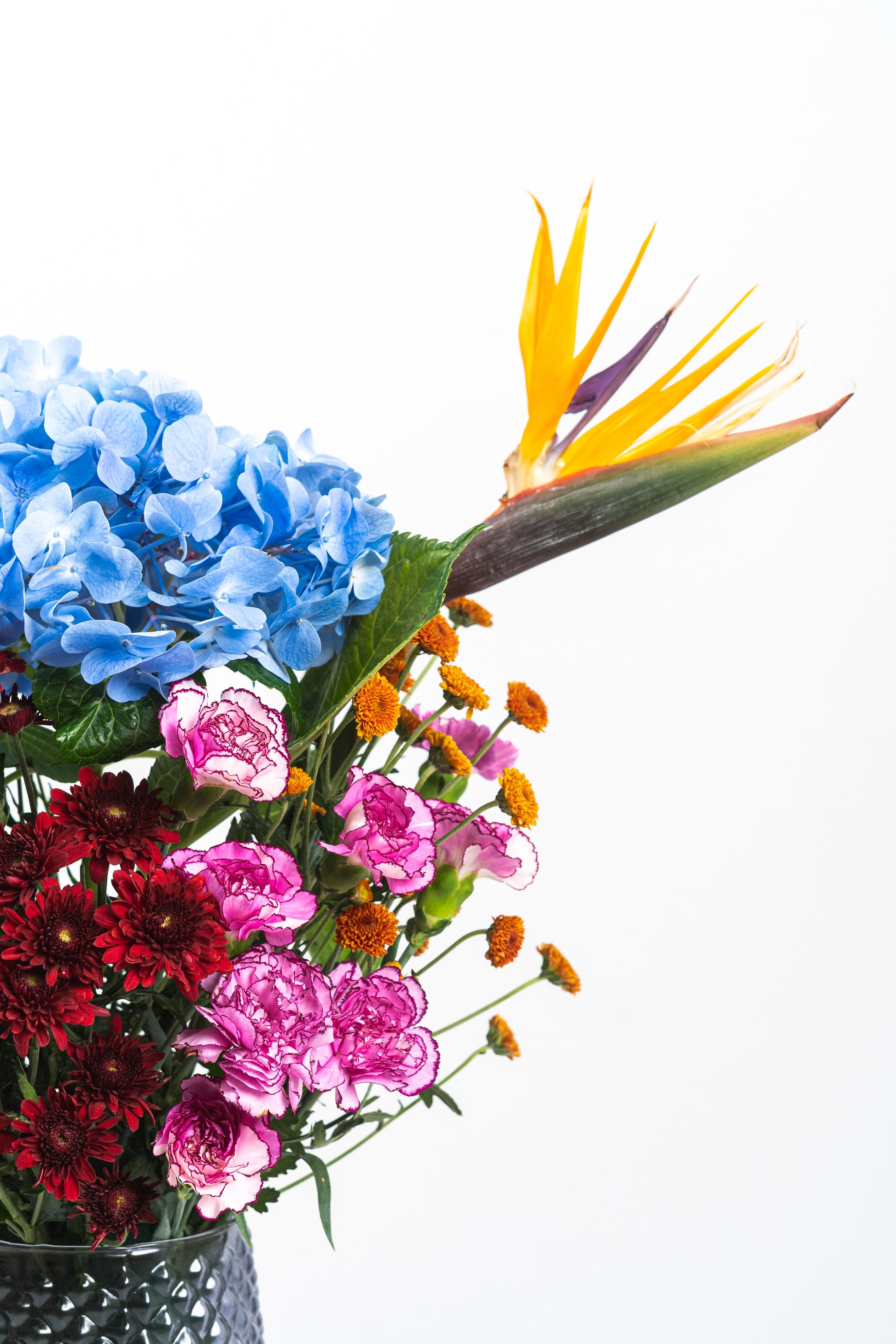 Blue hydrangea ,birds of paradise, red chrysanthemums, orange chrysanthemums, pink carnations