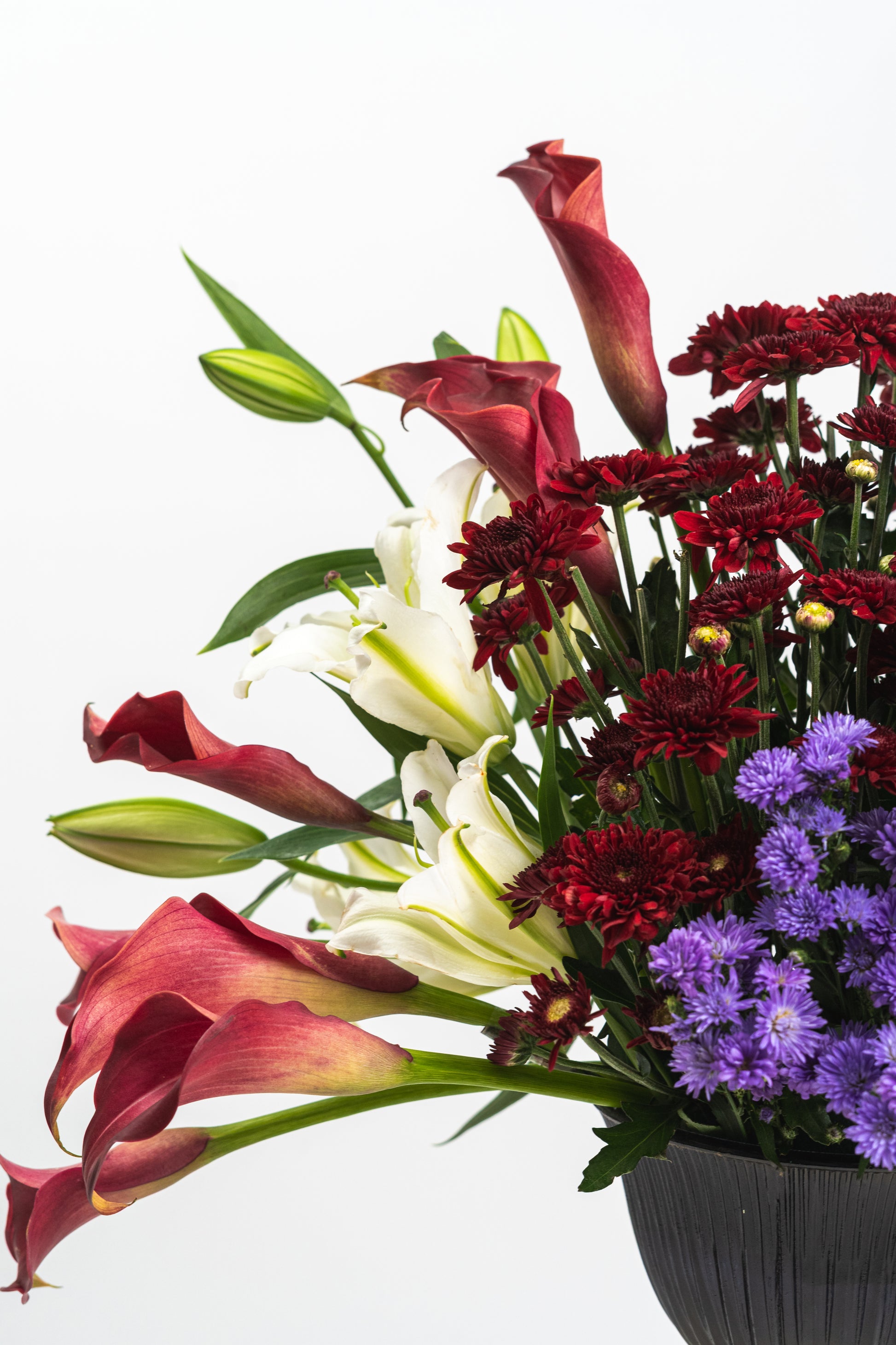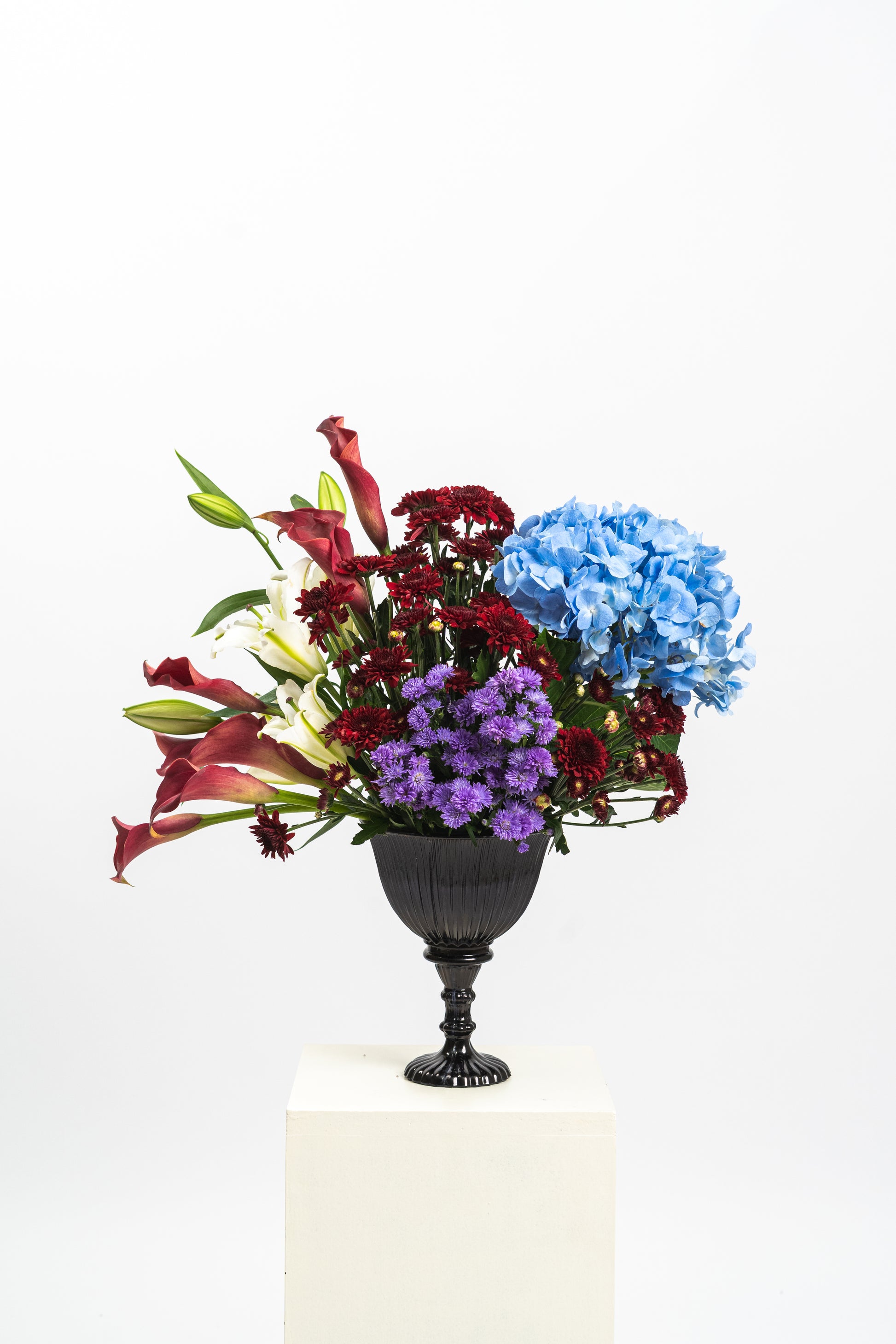 Blue Hydrangea, Red Chrysanthemums, Cala Lilies, White Lilies, Purple Aster