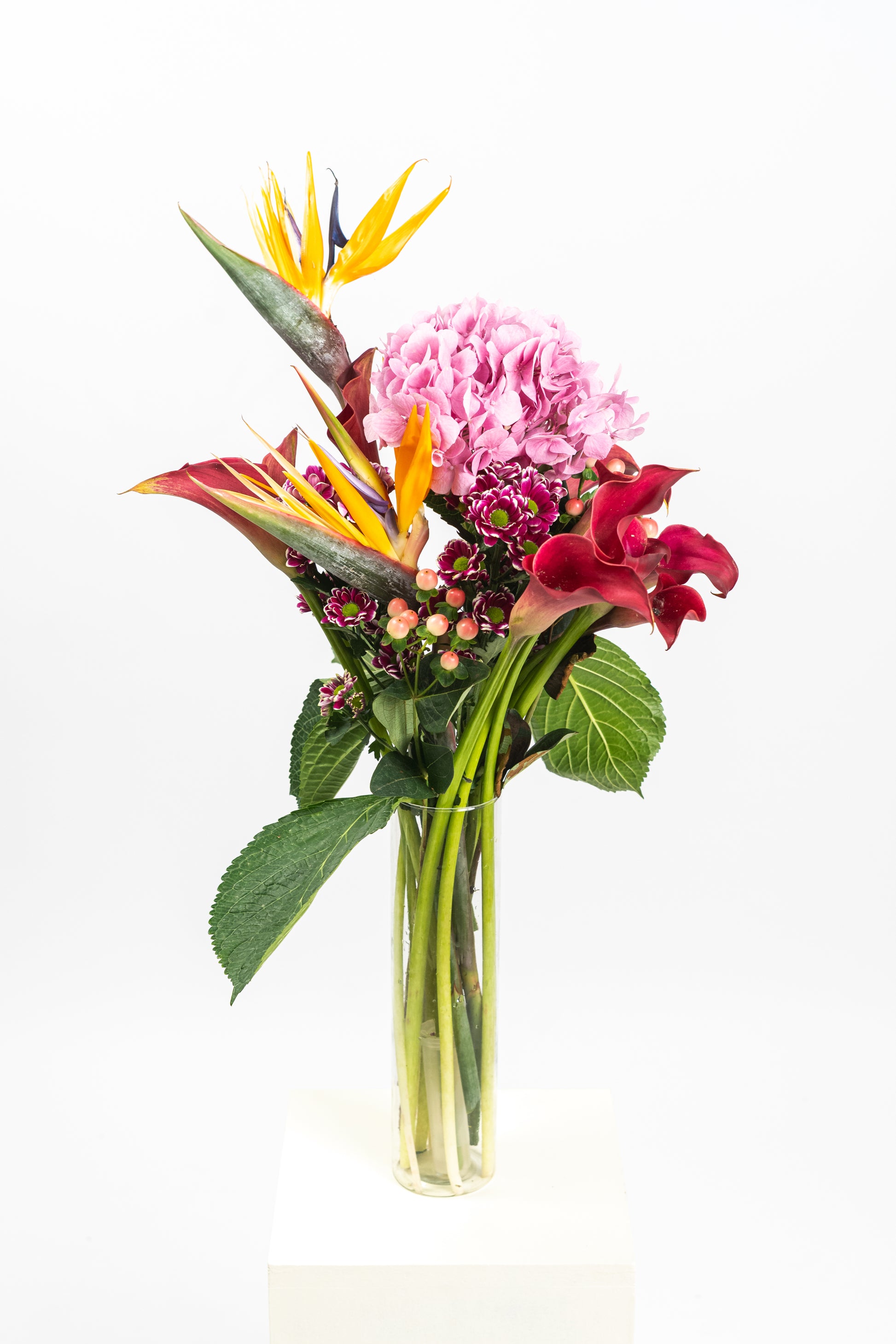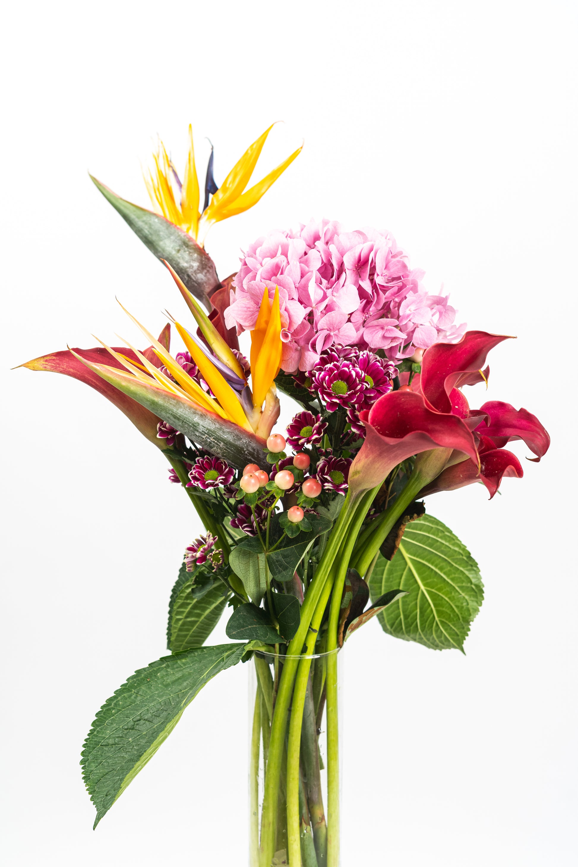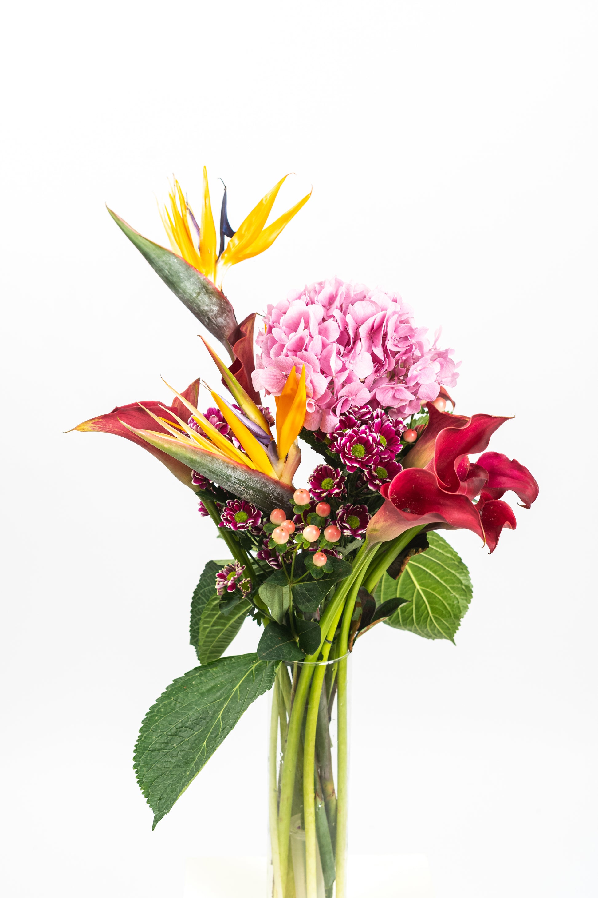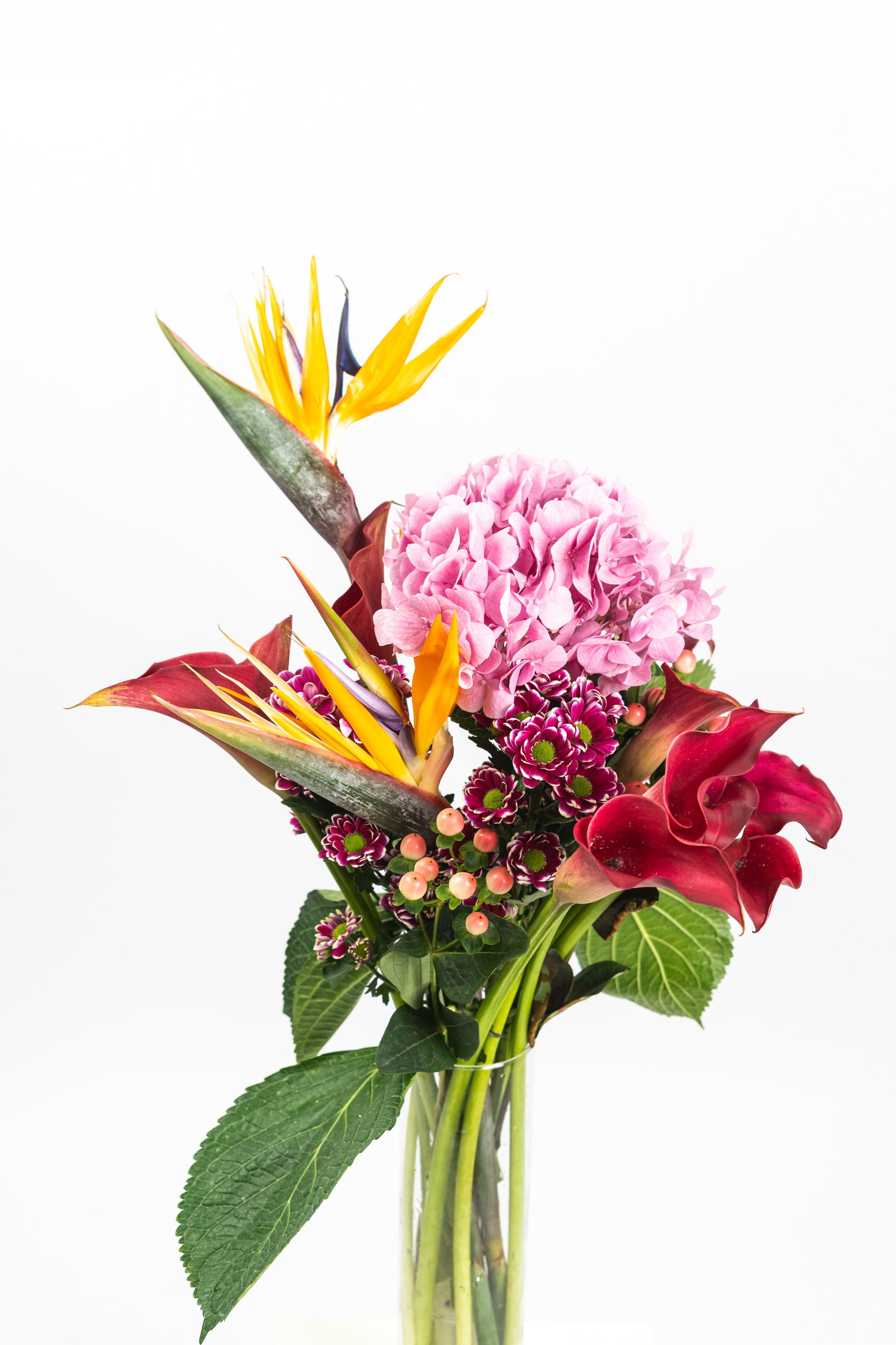 Birds of paradise, cala lilies, pink hydrangea, purple chrysanthemums, pink berries